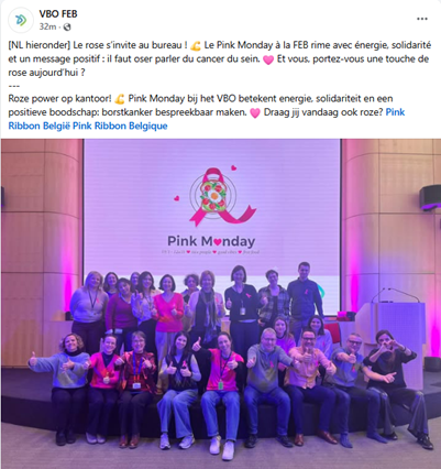 Ook tientallen andere bedrijven gaven hun digitale logo een roze jasje voor een dag en zetten leuke beelden en informerende tekstjes op hun sociale mediakanalen dankzij dekant-en-klare digitale Pink Monday-toolkit die ze konden gebruiken.