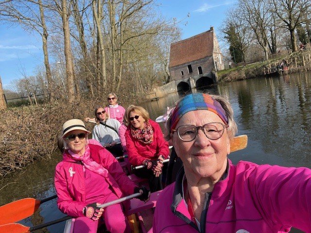 Pour faire partie d'un groupe de Pink Ribbonettes , il faut avoir eu un cancer du sein, mais un gros bras n'est certainement pas une condition préalable. Les exercices de musculation, comme le canotage, sont bénéfiques pour tous les patients. Tous les groupes ne disposent pas d'un bateau-dragon. Les groupes de Bruxelles et de Turnhout ont leur propre bateau-dragon. Sur la Nete à Lier, il est difficile de manœuvrer un bateau-dragon", explique Monique Quaeyhaegens. Nous utilisons un bateau à dix places, celui où l'on fait les mêmes mouvements de pagaie. Notre groupe est affilié au club de canoë de Lier. Nous pouvons utiliser l'un de leurs bateaux. Les Pink Ribbonettes de Lier se réunissent tous les dimanches matin pour pagayer sur la Nete. "S'il fait vraiment trop froid, en plein hiver, nous allons nous promener. Nous sommes devenus un vrai groupe d'amis.